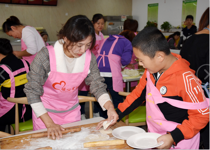 有些大姐还带了自己家的孩子一起参加这次公益活动,以身作则,以实际行动教育孩子们尊老爱老。孩子们也非常活跃,不管是包饺子还是擀皮,都积极参与。