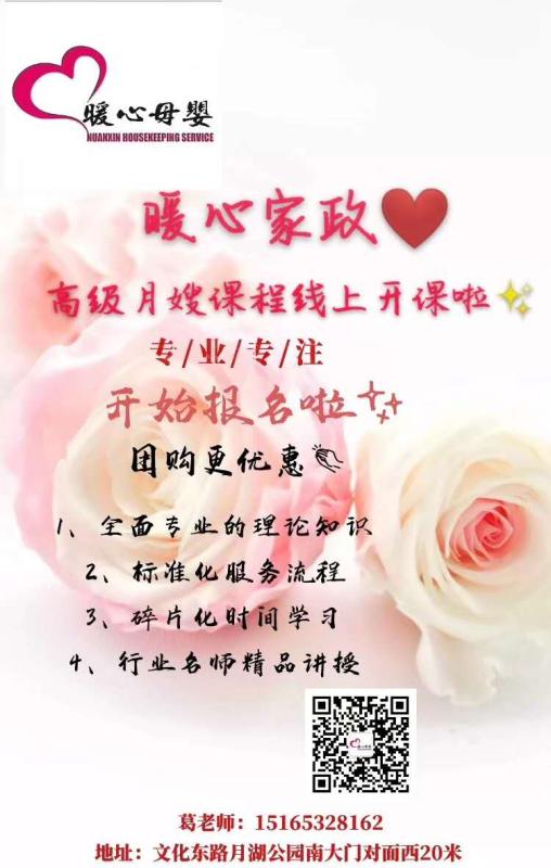 暖心家政于2013年经青岛市工商局批准成立,具备独立法人资格。是一家集母婴护理,育婴早教,老年护理为一体的综合性服务机构,常年开设高级月嫂 育婴师,面点师、茶艺师,催乳师,养老护理等方面的课程培训,培养社会需要的各方面专业人才。