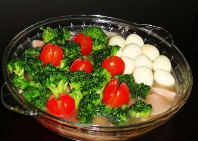 - 做法:西兰花焯水;鹌鹑蛋煮熟剥皮;火腿切丁。火腿加水煮沸后转小火煮10分钟,加入鹌鹑蛋、西兰花、小番茄再次煮沸,调味即可。