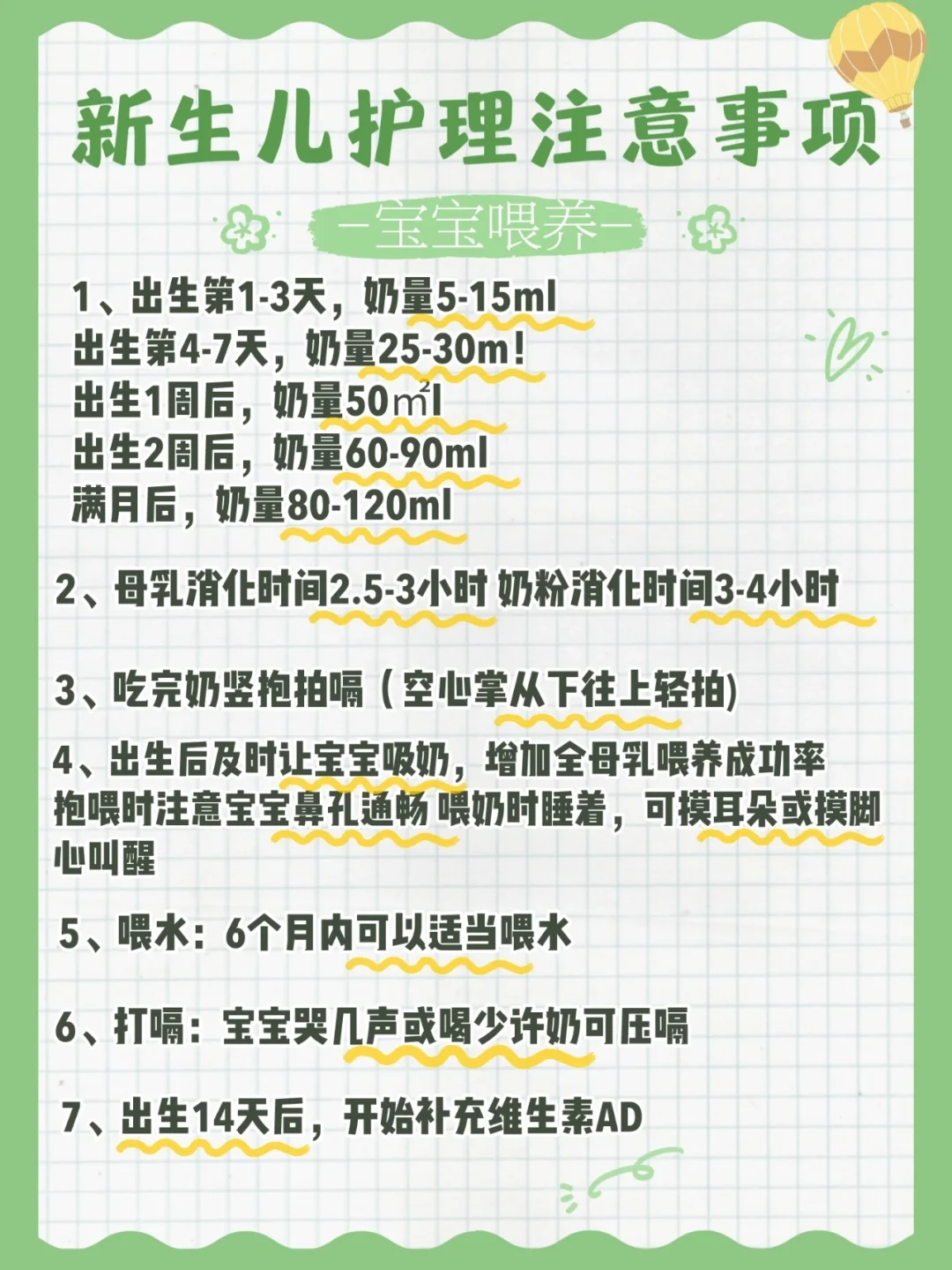 出生第1-3天,奶量5-15ml;第4-7天,奶量25-30ml;1周后,奶量50ml;2周后,奶量60-90ml;满月后,奶量80-120ml。